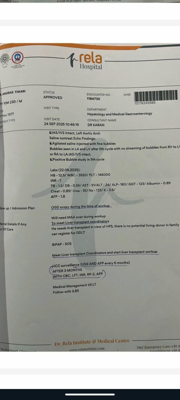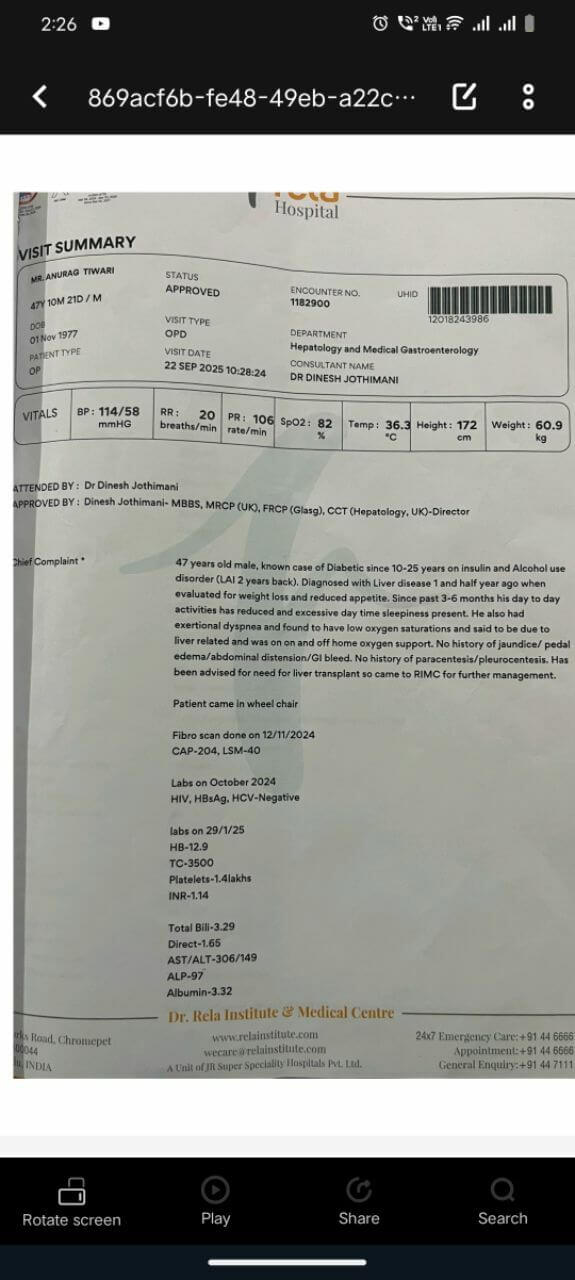 He was first diagnosed with Grade 1 Liver Cirrhosis a few years ago. Back then, we thought with medicines and care, he’d recover. But slowly, the disease began taking more from him - his energy, his strength, his smile. And then came the second blow: Hepatopulmonary Syndrome. The doctors explained it simply that his liver is so damaged that it’s making his lungs weak. His body can’t get enough oxygen anymore.